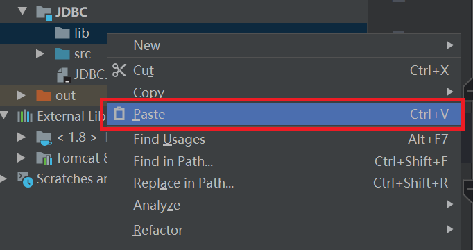 - 复制其中的mysql-connector-java-8.0.18.jar文件,在lib文件夹上右键,粘贴到IDEA中,刚刚新建的lib文件夹里