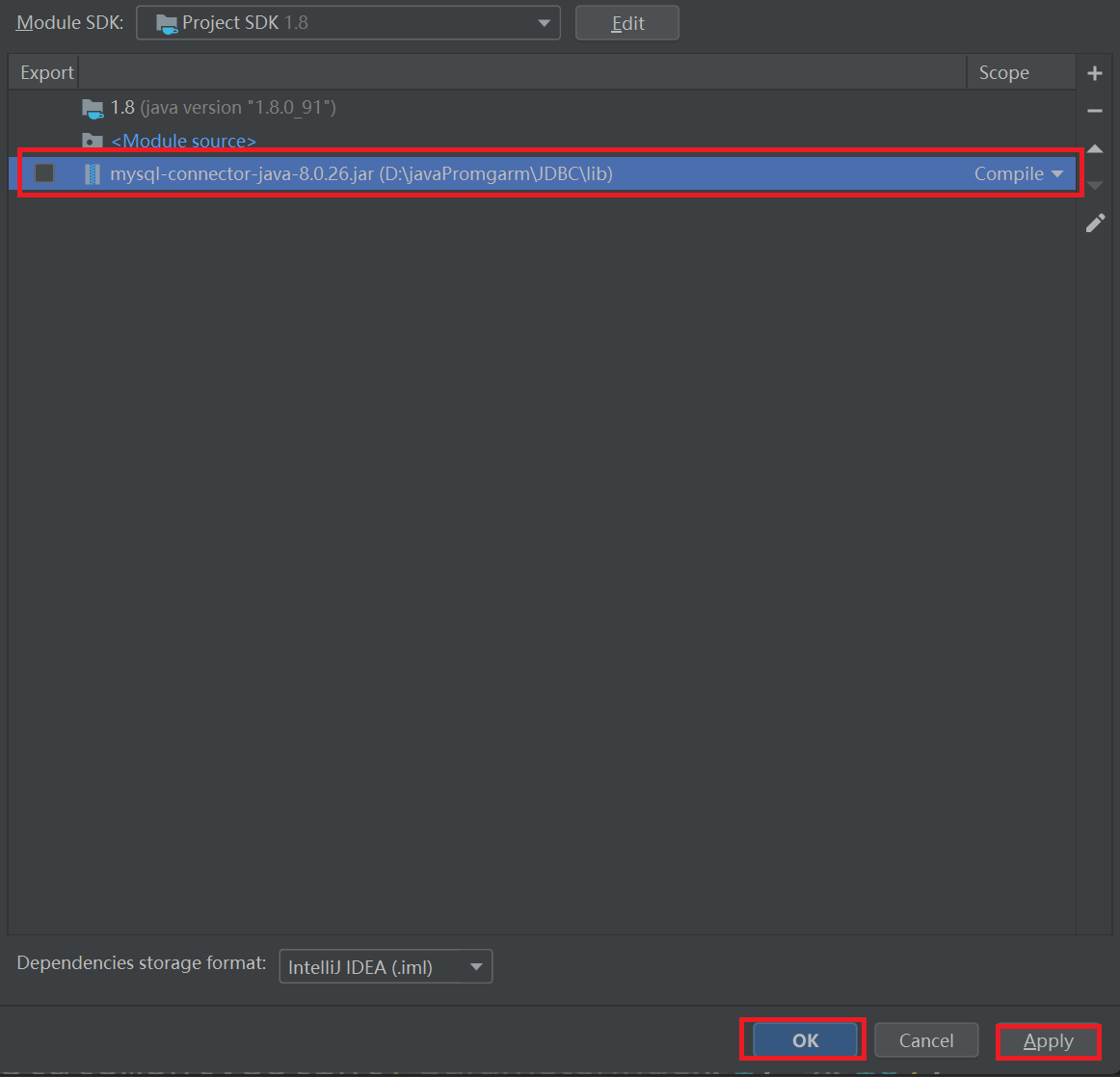 - 可以看到Module模块中,多出了一个mysql驱动,选择之后点击Apply,然后Ok