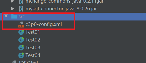 - 接着要配置c3p0-config.xml文件(这里选择xml配置)→直接配置到src文件夹下,否则会报配置错误