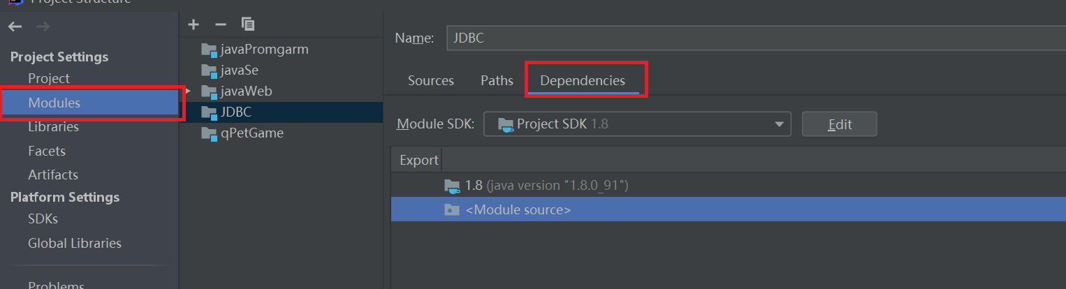 - 在Modules中选择Denpendencies