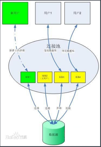 - 连接池的基本思想是在系统初始化时,将数据库连接作为对象存储在运行内存中,当用户需要访问数据库时,并非建立一个新的连接,而是从连接池中取出一个已建立的空闲连接对象.使用完毕后,用户也并非将连接之间关闭,而是将连接放回连接池中,提供给下一次请求访问使用,而连接池的建立,断开都由连接池自身来管理.同时,还可以通过设置连接池的参数来控制连接池中的初始连接数,连接的上下限数以及每个连接的最大使用次数,最大空闲时间等等