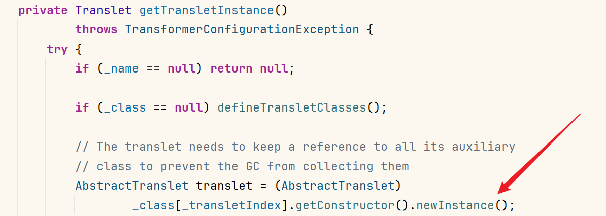 在getTransletInstance中_class类被创建实例,调用构造方法,至此成功命令执行。这就是为什么没有自己调用newInstance而仍能命令执行的原因。