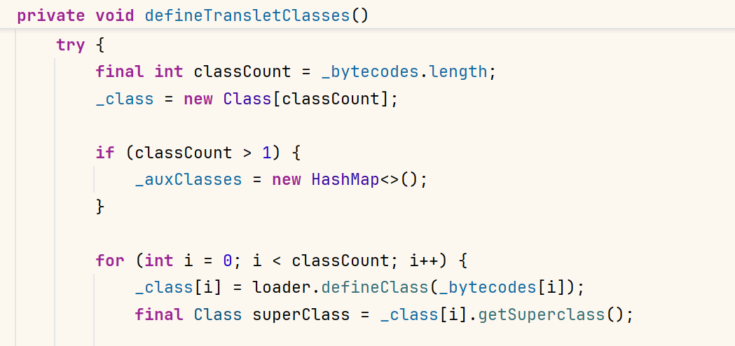 在defineTransletClasses中,加载_bytecode获得的Class对象赋给了_class