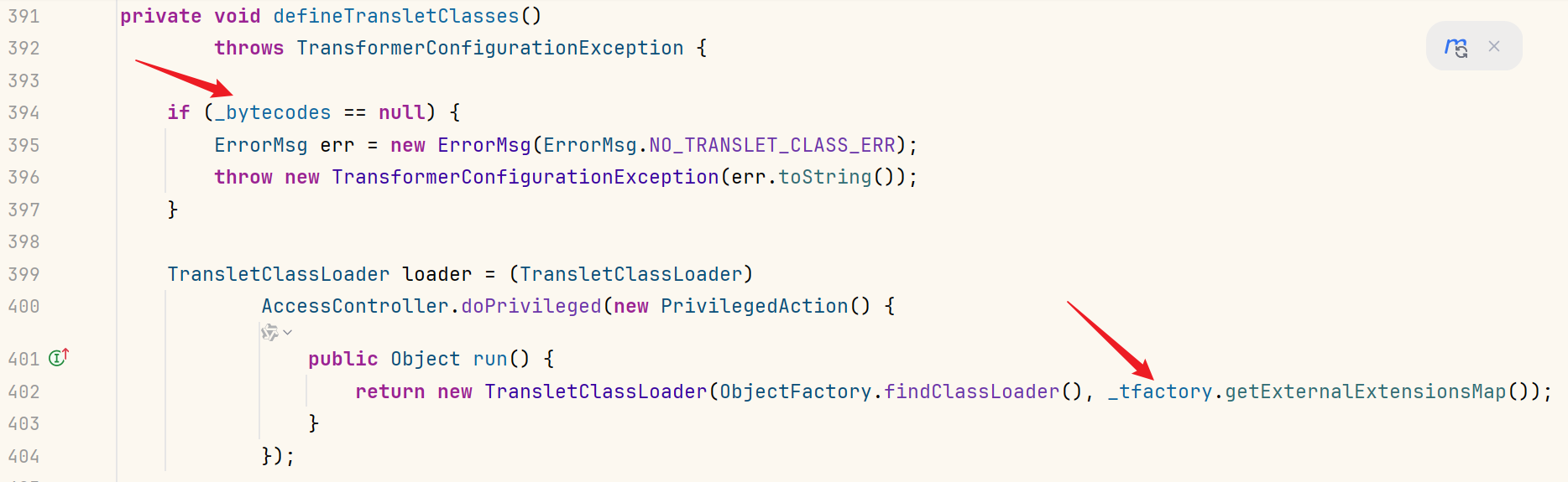 接着进入defineTransletClasses,如果_bytecode为空会报此 Templates 不包含有效的 translet 类定义的错误,如果_tfactory为为null程序会直接返回。