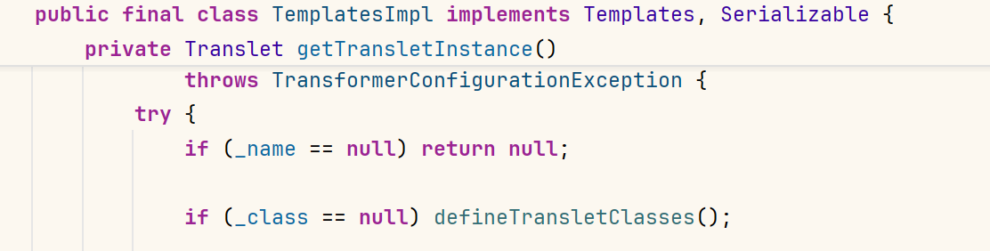 查看TemplatesImpl类的getTransletInstance方法,可以看到需要经过两个if判断才能调用defineTransletClasses,_name需要赋一个String类型的值,_class本来就是null无需修改,我们来反射修改_name的值。