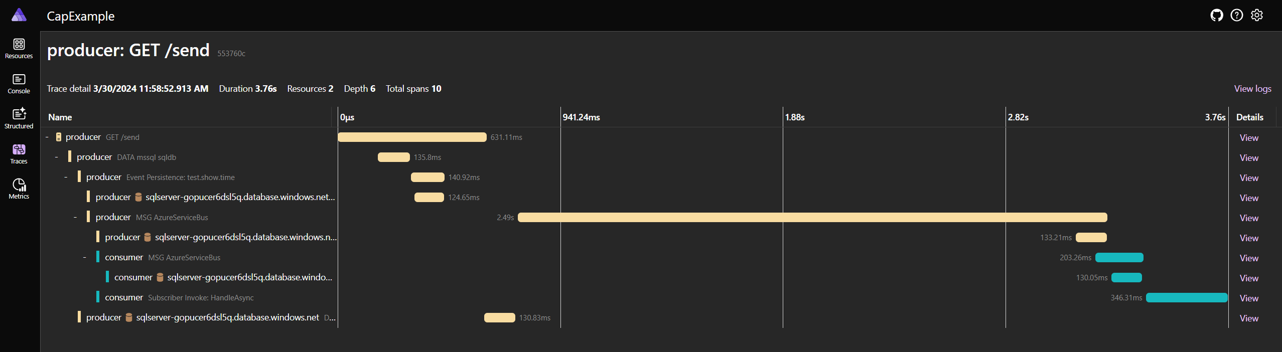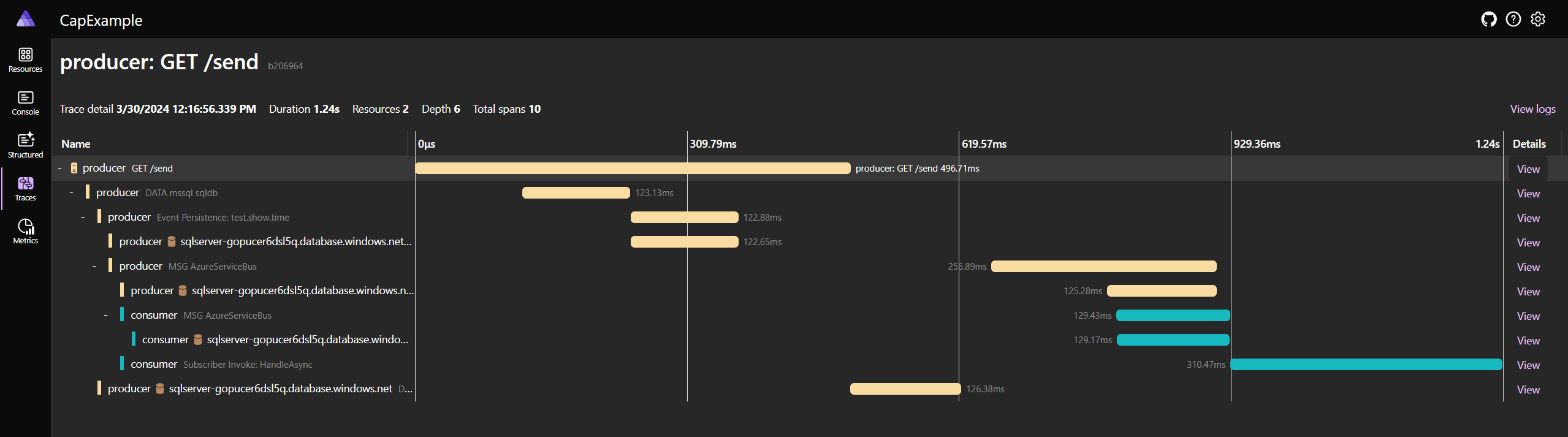 当使用像 DotNetCore.CAP 这样的消息代理时,消息通常通过中间代理从生产者发送到消费者。此过程中的每个步骤都可以被视为一个跨度,它代表一个工作单元或一个操作。