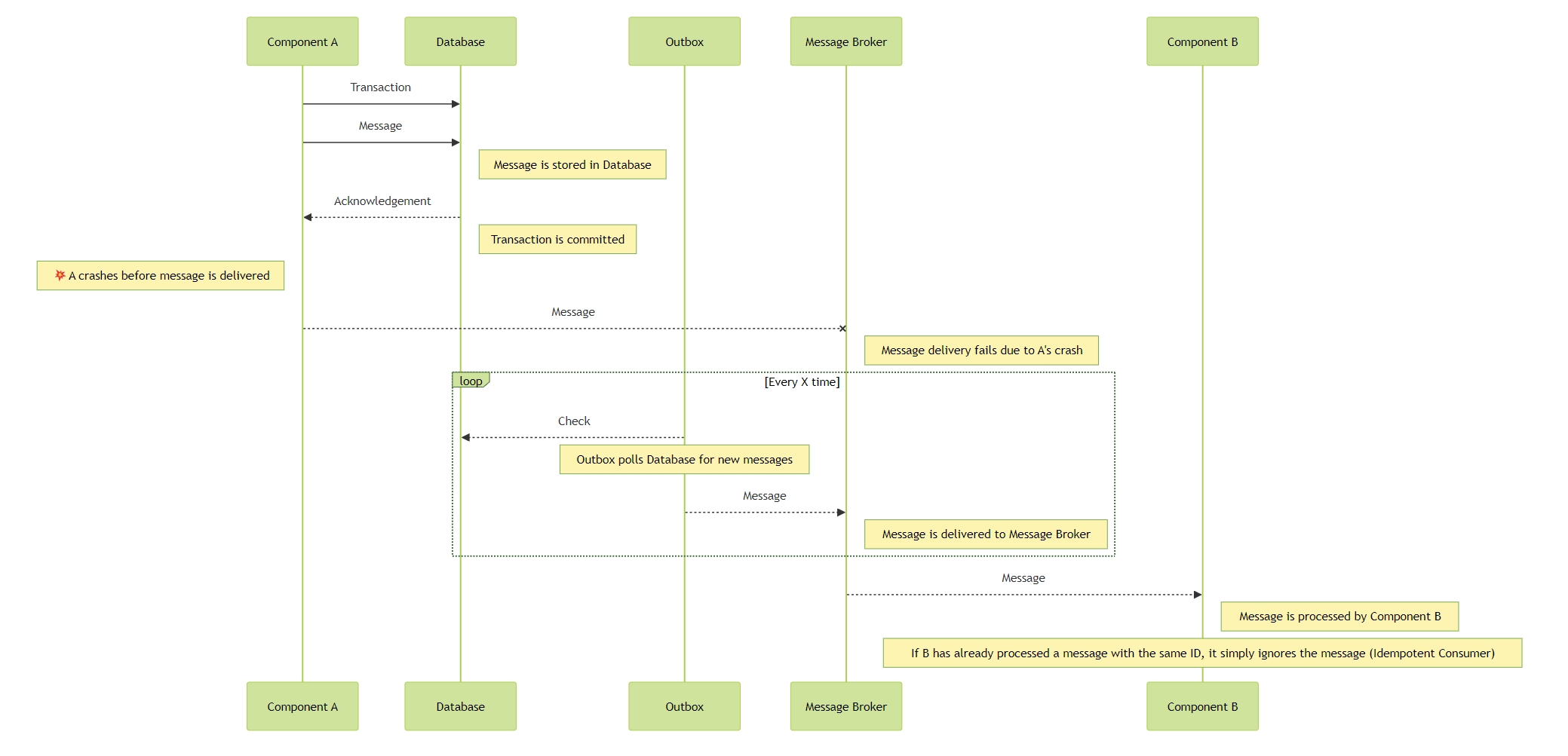 - 消息发送失败:即使服务没有崩溃,由于网络问题或消息代理问题,消息发送也可能失败。如果不重试消息发送操作,消息将丢失。