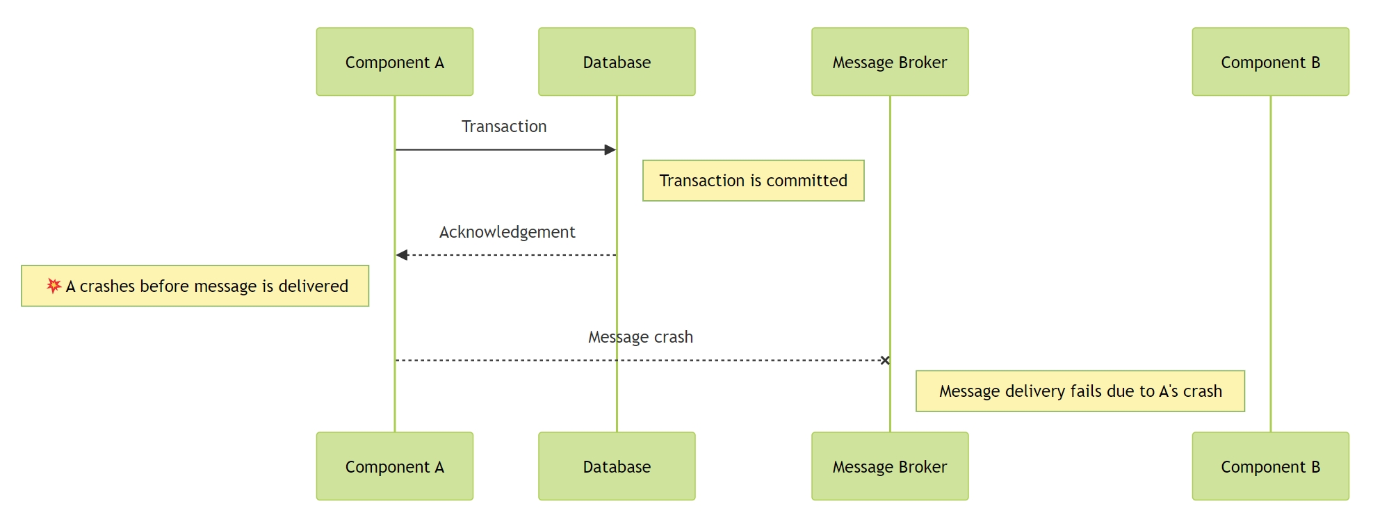 - 事务提交和消息发送不是原子的:在通常情况下,Service 可能首先将事务提交到其数据库,然后向消息代理(Broker)发送消息。如果服务在事务提交之后但在消息发送之前崩溃,则消息将丢失。其他服务将不知道已提交到数据库的更改。