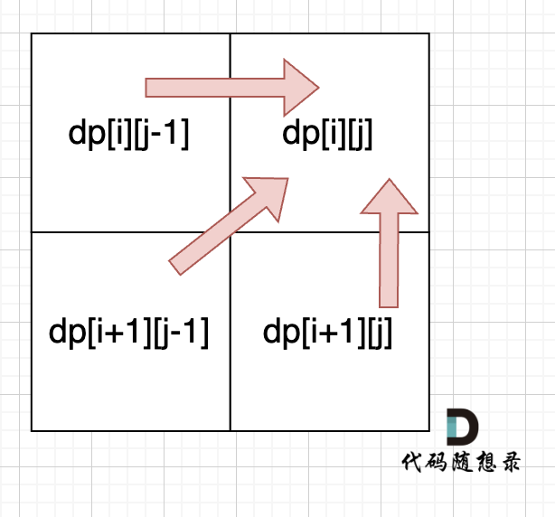 从递归公式中,可以看出,dp[i][j] 依赖于 dp[i + 1][j - 1] ,dp[i + 1][j] 和 dp[i][j - 1],如图: