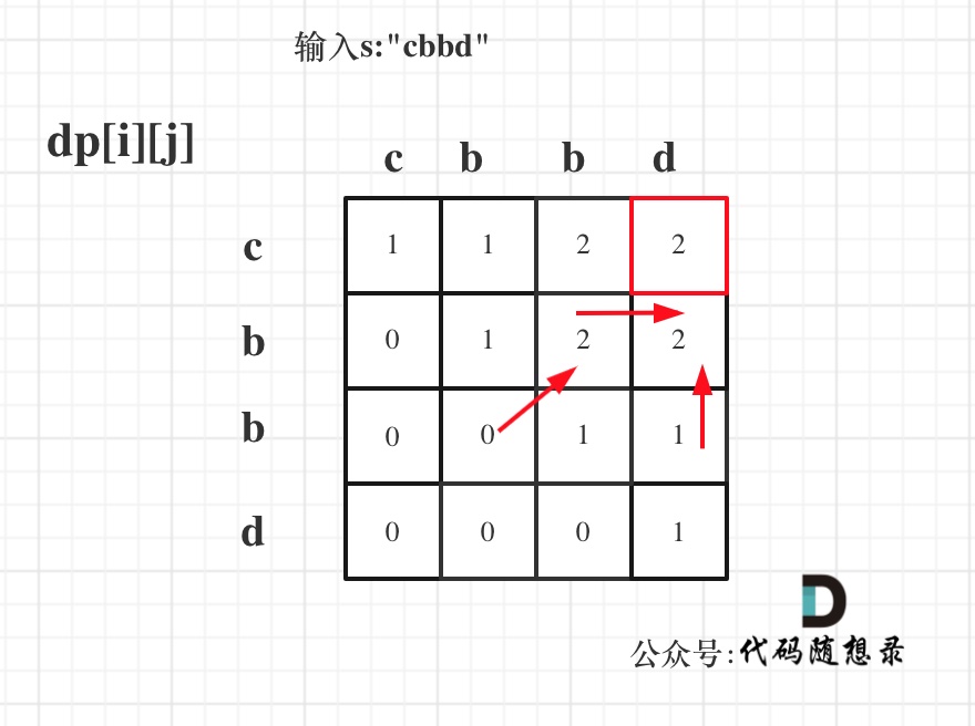 输入s:”cbbd” 为例,dp数组状态如图: