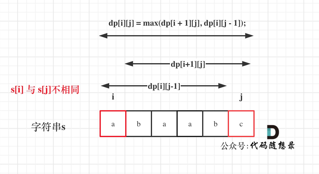 s[i]与s[j]不相同,说明s[i]和s[j]的同时加入 并不能增加[i,j]区间回文子序列的长度,那么分别加入s[i]、s[j]看看哪一个可以组成最长的回文子序列。