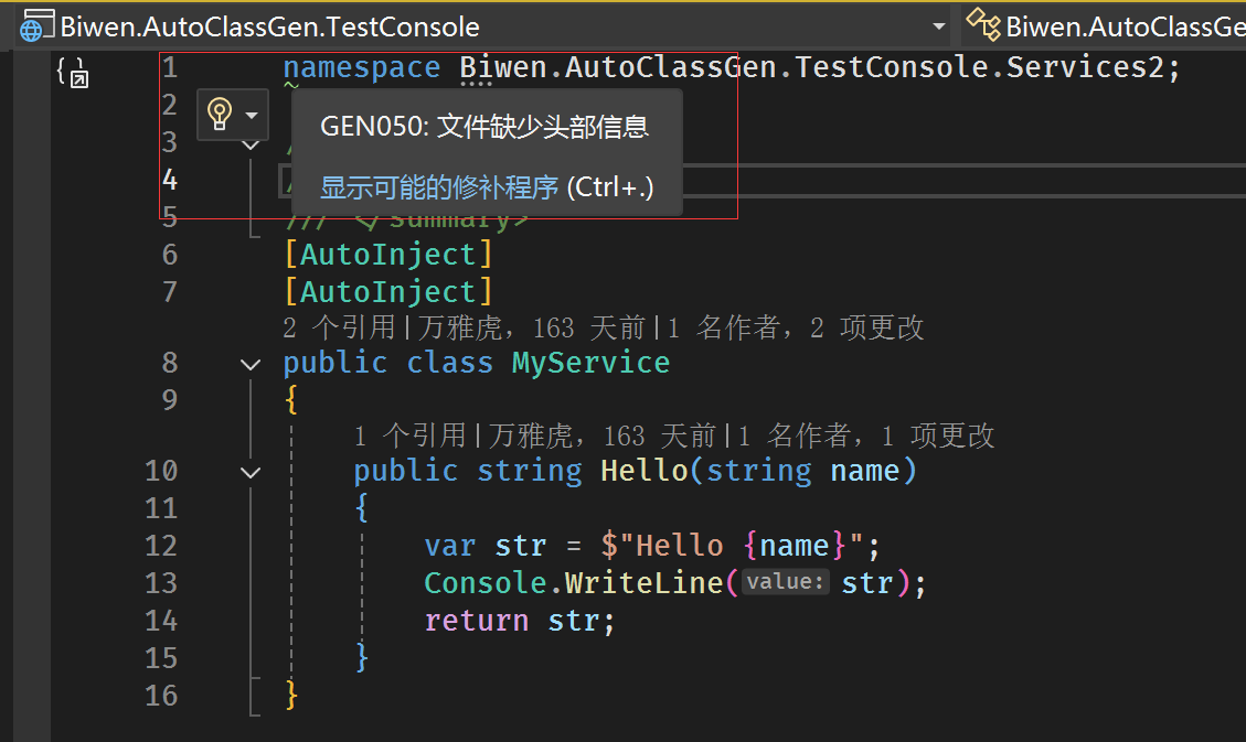 分析器完成了,现在我们就来实现名为AddFileHeaderCodeFixProvider的修复器,