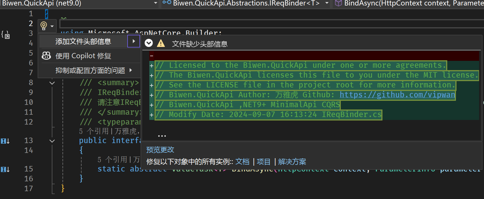 之前写过两篇关于Roslyn源生成器生成源代码的用例,今天使用Roslyn的代码修复器CodeFixProvider实现一个cs文件头部注释的功能,