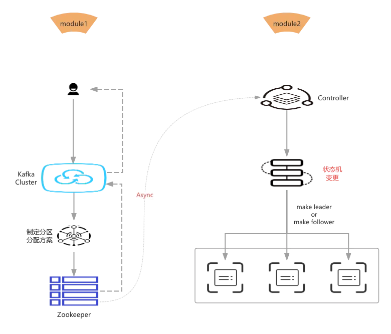 - Controller负责监听Zookeeper的回调函数拿到元数据变更后,触发状态机并真正执行副本分配