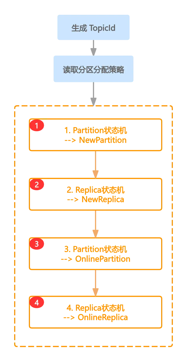 所谓副本状态机,对应的申明类为kafka.controller.ReplicaState,共有7种状态:NewReplica、OnlineReplica、OfflineReplica、ReplicaDeletionStarted、ReplicaDeletionSuccessful、ReplicaDeletionIneligible、NonExistentReplica。在Topic新建的流程中,我们只会涉及其中的3种:NewReplica、OnlineReplica、NonExistentReplica,且副本状态机在新建流程中发挥的空间有限,不是本文的重点,读者对其有个大致概念即可