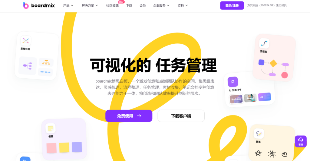 BoardMix 是一款由国内领先的科技企业开发的在线团队协作工具,凭借其先进的AI技术和高效的协作功能,迅速在市场上崭露头角,成为国内团队协作工具中的热门选择。它不仅在企业市场中站稳脚跟,还广受创意团队和项目管理团队的青睐。