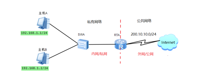 图中主机A和主机B的私有地址通过NAT技术的帮助下,转化为公有网络与公网进行通信。