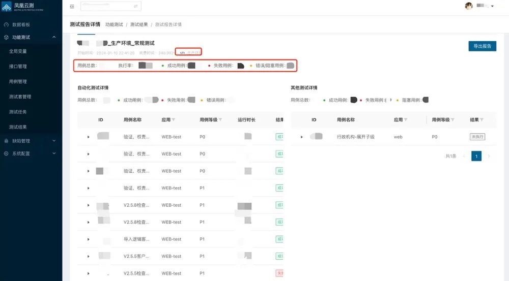 作用:快速验证发版后接口响应及功能表现是否正常。发版后能快速定位响应问题,解决问题时效得到极大提升。下图为某项目生产点火测试结果部分截图: