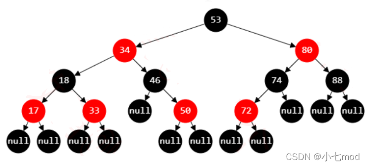 - 每个叶子节点都是黑色的,这里的叶子节点指的是最底层的空节点,即图中值为 null 的节点,讨论时一般将其省略,值为 null 的根节点在红黑树中不看作叶子节点
