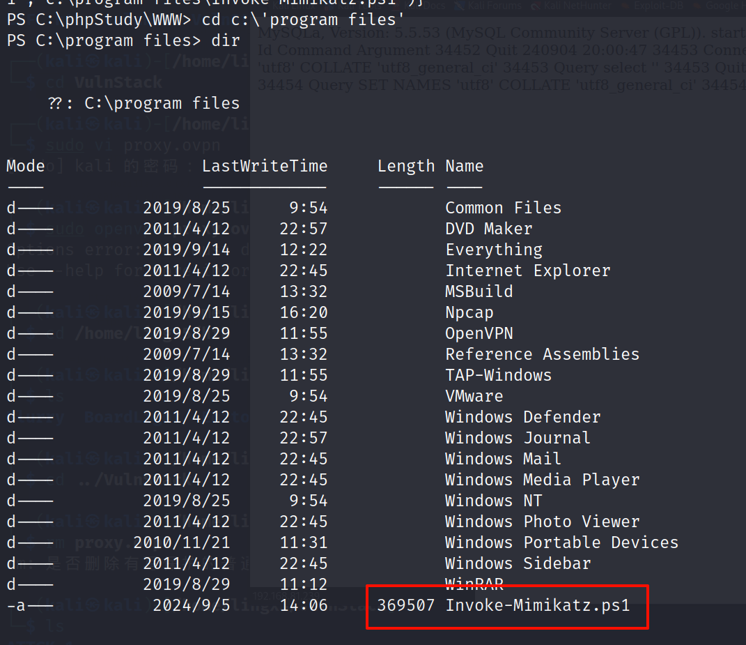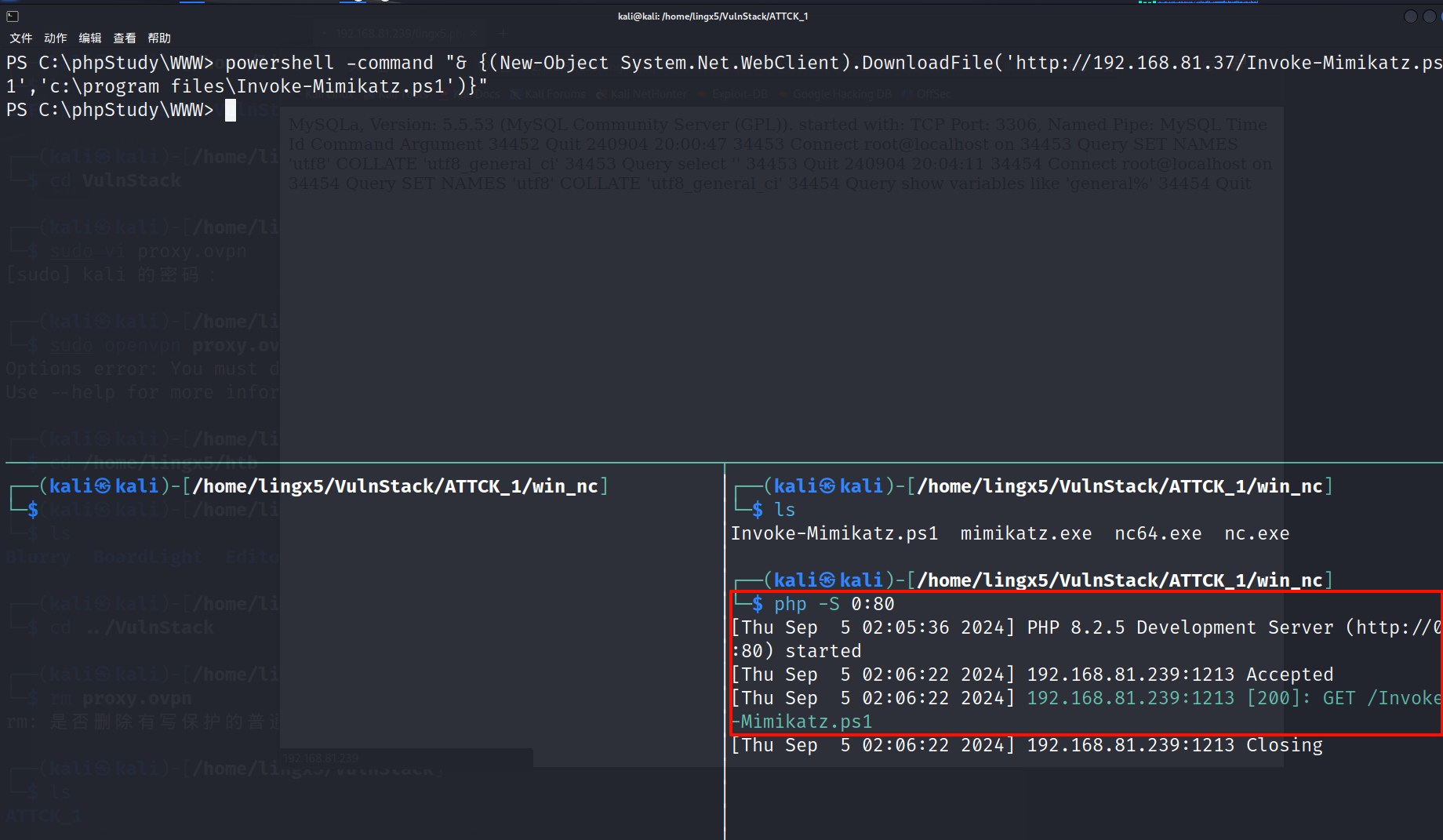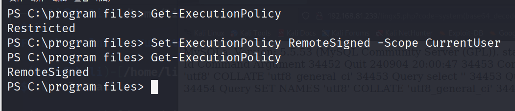 下载成功,收到反弹 shell,但是和之前的 shell 是一样的,还是不能运行 mimikatz.ps1