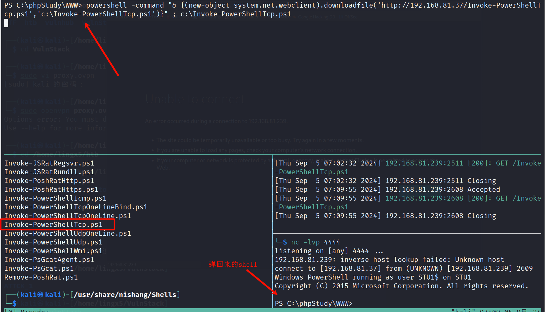 我们用 nishang 的 tcp 的脚本,反弹回来的会不会更加稳定呢?尝试用 nishang 反弹