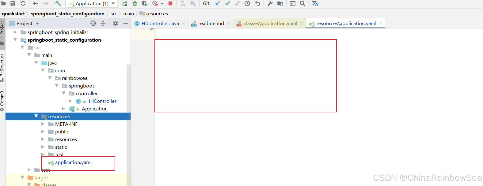 同样要想改变 Spring Boot 当中的默认静态资源,这里我们还是使用 yaml 语法进行。在 resources 类路径下创建一个名为 application.yaml 的文件。