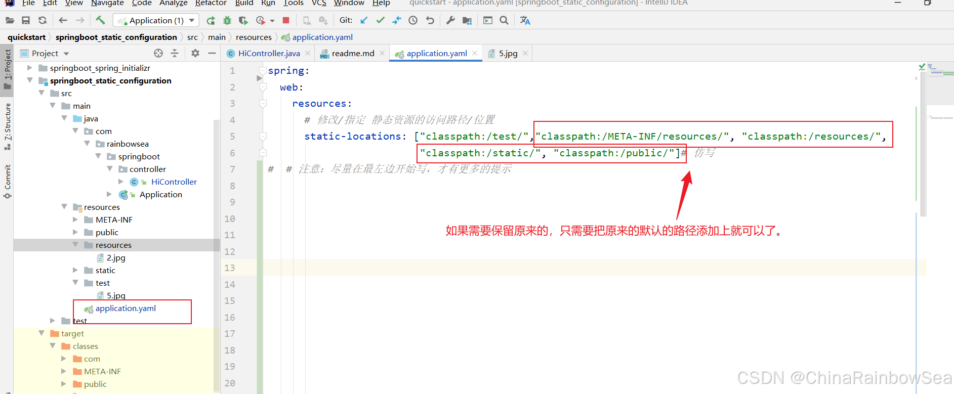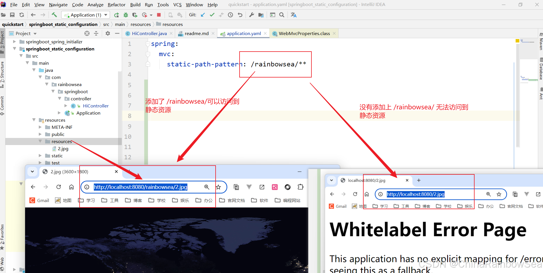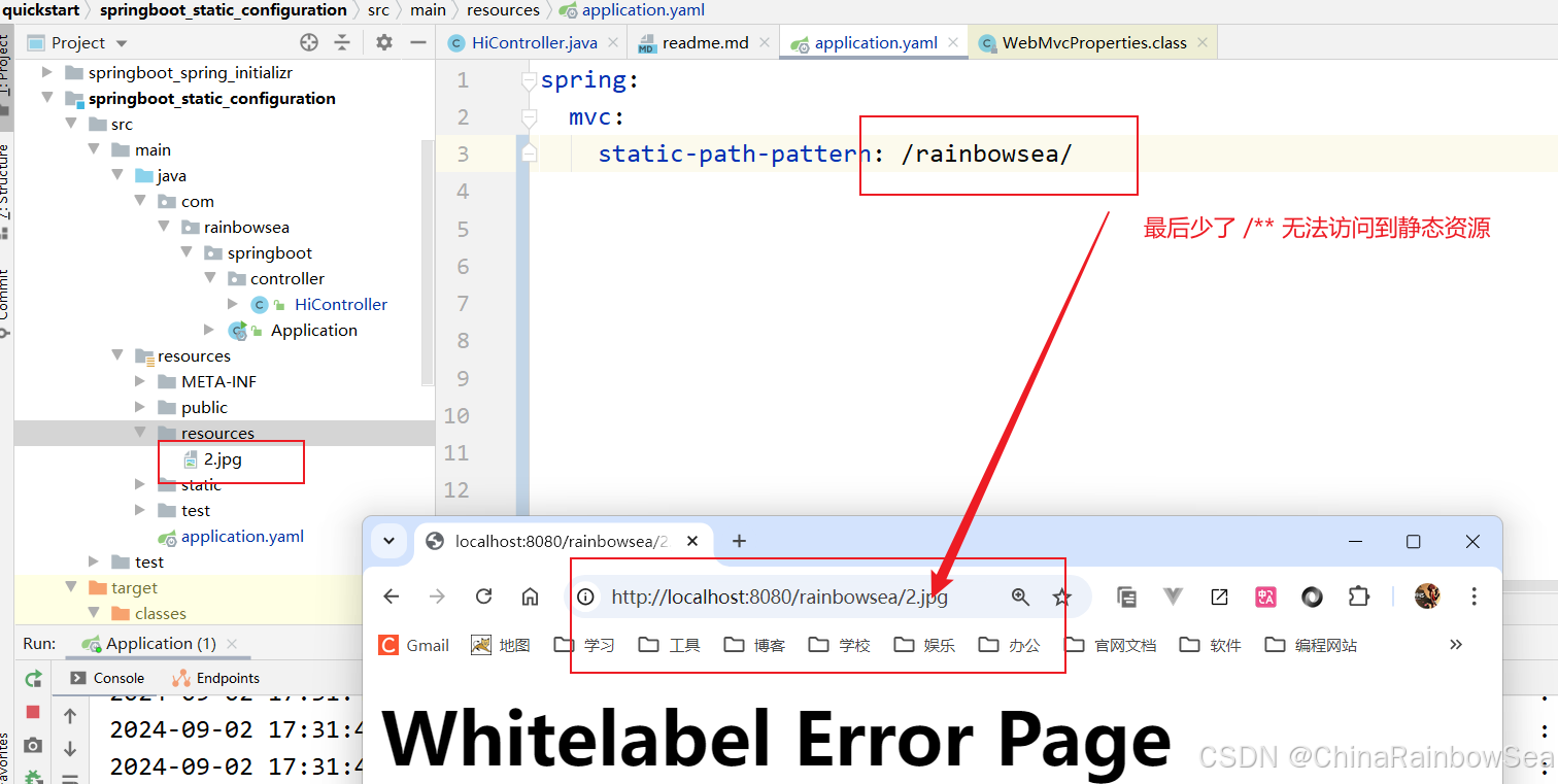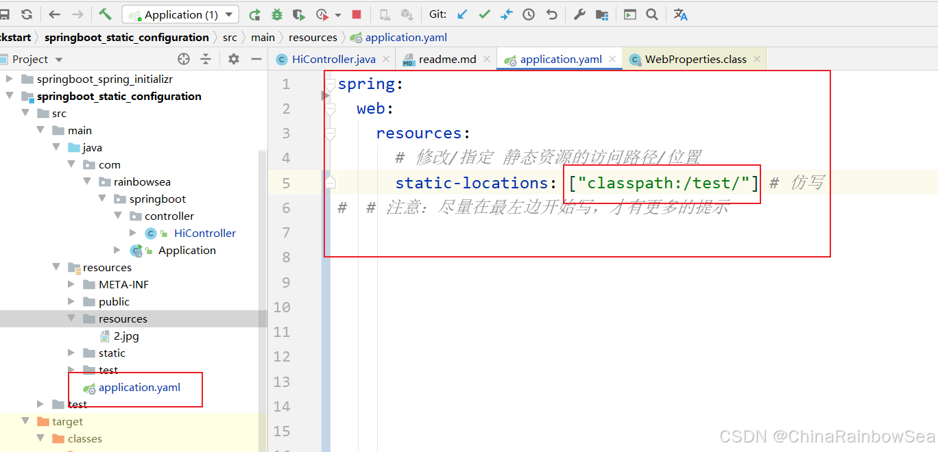 - 改变静态资源访问前缀,比如我们希望 http://locahost:8080/rainbowsea/* 下的请求路径,去请求静态资源,应用场景:静态资源访问前缀和控制器请求路径冲突。