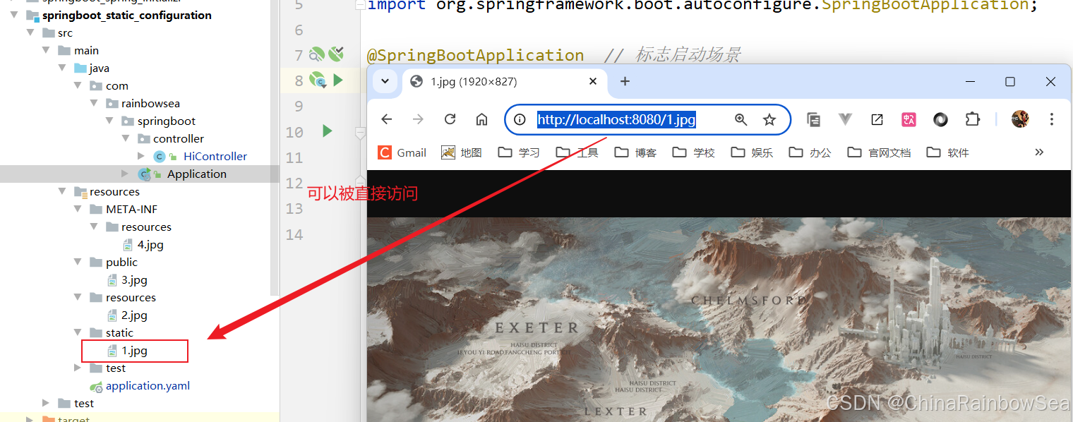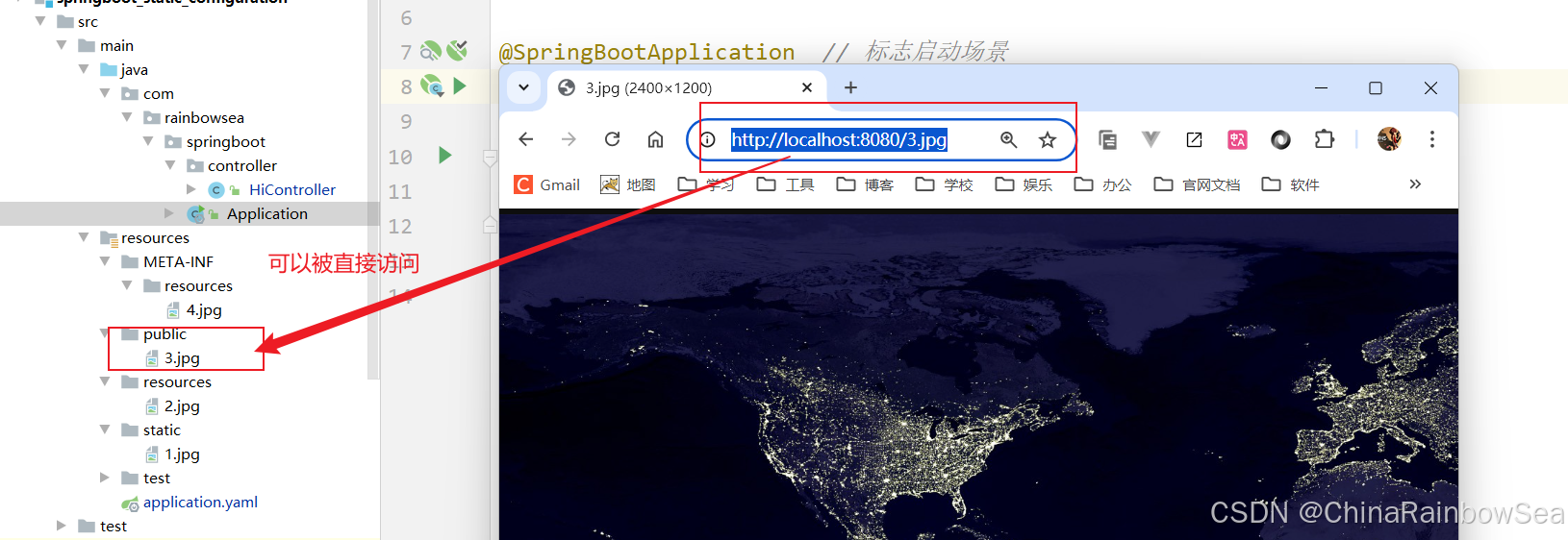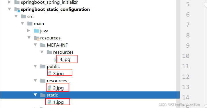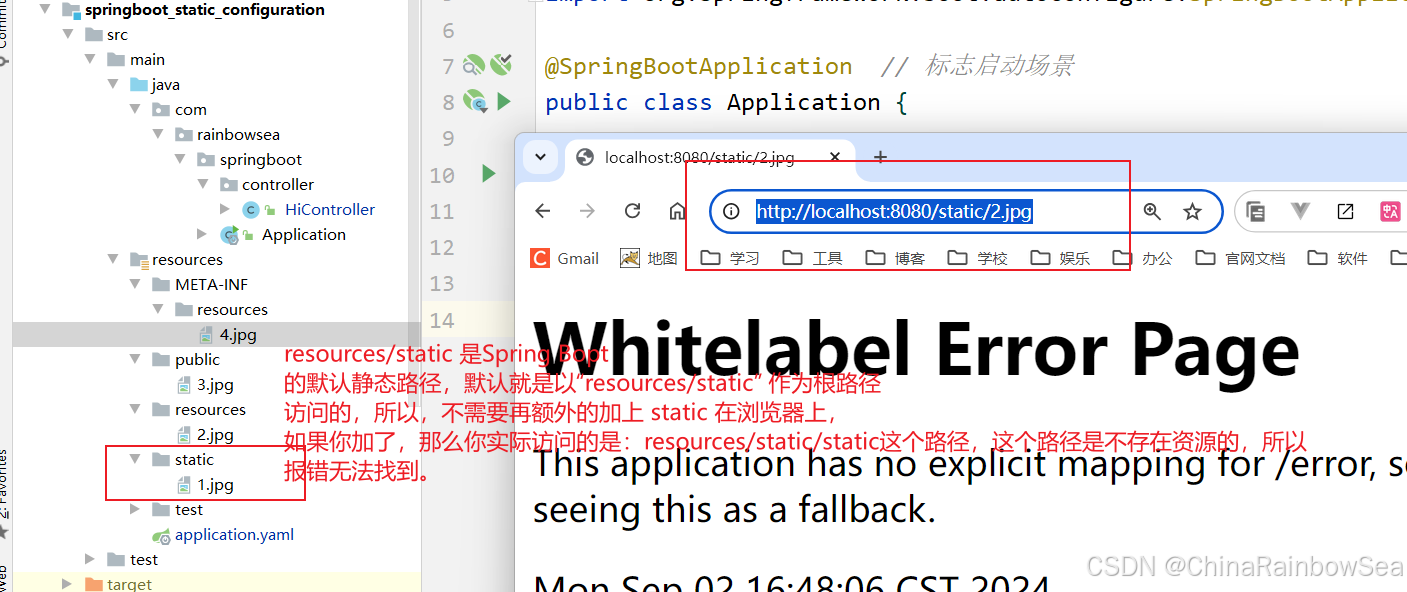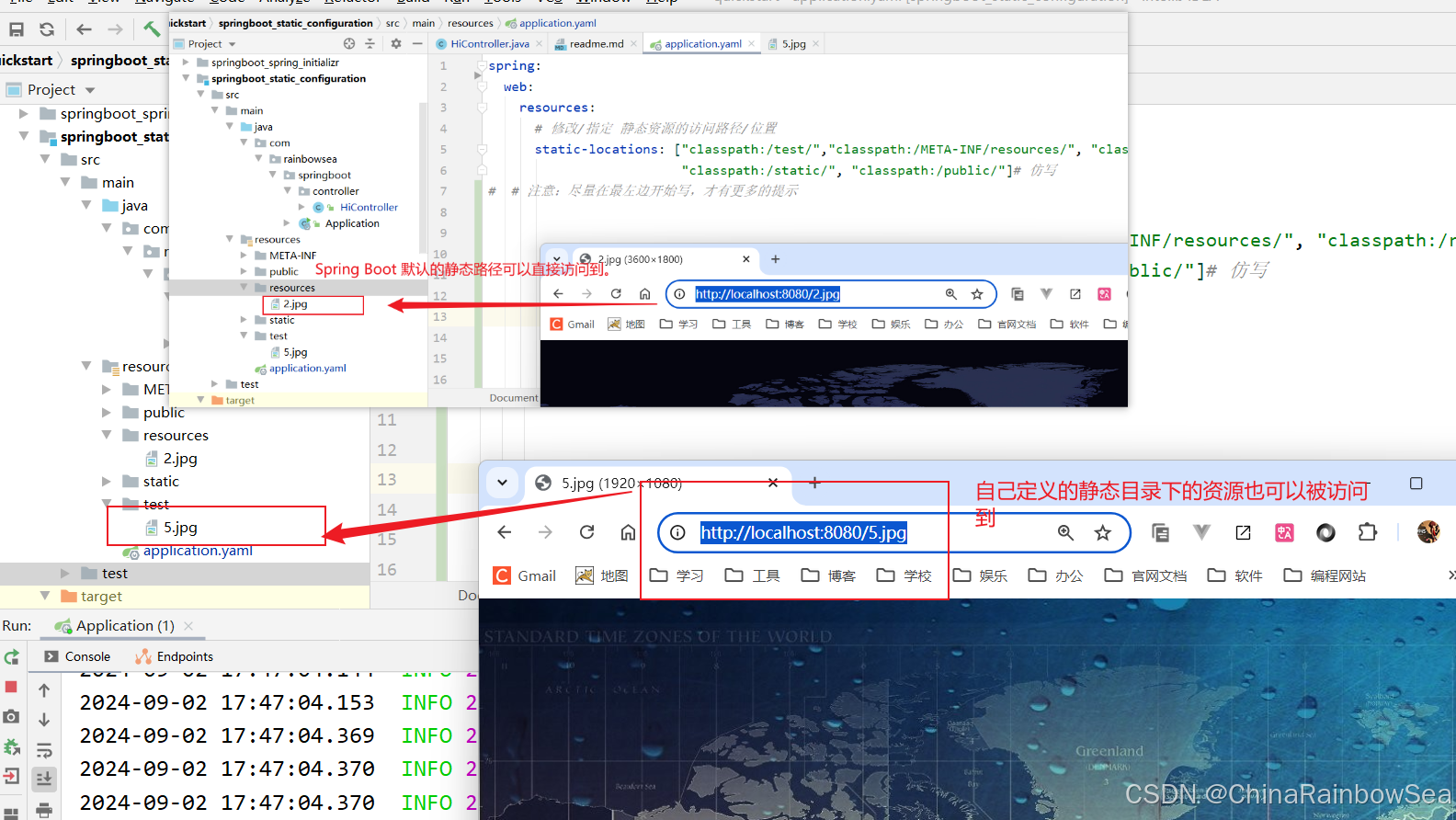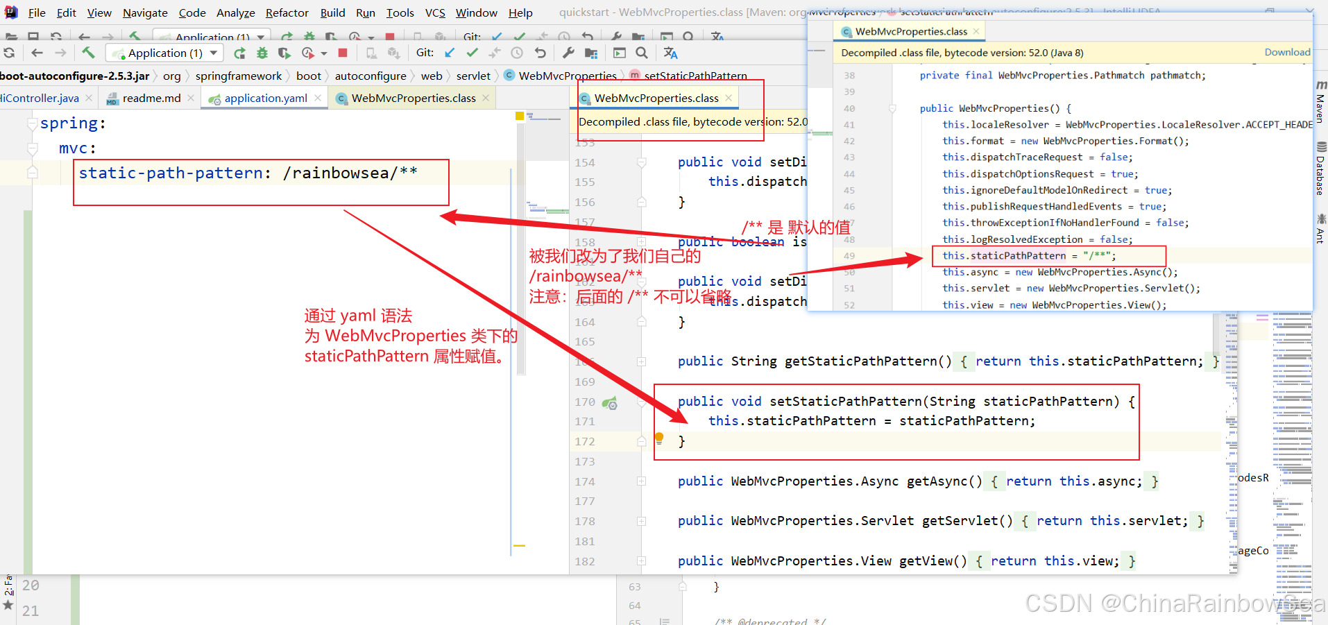 - 改变静态资源访问前缀,比如我们希望 http://locahost:8080/rainbowsea/* 下的请求路径,去请求静态资源,应用场景:静态资源访问前缀和控制器请求路径冲突。