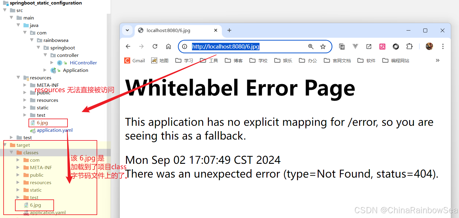 注意:classpath:/resources/ 表示服务器就会在 resources 路径下找,你在浏览器当中输入的url地址的时候,不可以输入 resources 目录,因为服务器就是会在 classpath:/resources/ 找的,而如果你写了resources在浏览器上的话,你想表达的就是:让浏览器从resources/resouces的路径下找,这是找不到的报404错误