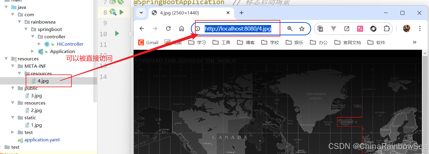 private static final String[] CLASSPATH_RESOURCE_LOCATIONS = new String[]{"classpath:/META-INF/resources/", "classpath:/resources/", "classpath:/static/", "classpath:/public/"}; 注意:classpath:/resources/ 表示服务器就会在 resources 路径下找,你在浏览器当中输入的url地址的时候,不可以输入 resources 目录,因为服务器就是会在 classpath:/resources/ 找的,而如果你写了resources在浏览器上的话,你想表达的就是:让浏览器从resources/resouces的路径下找,这是找不到的报404错误