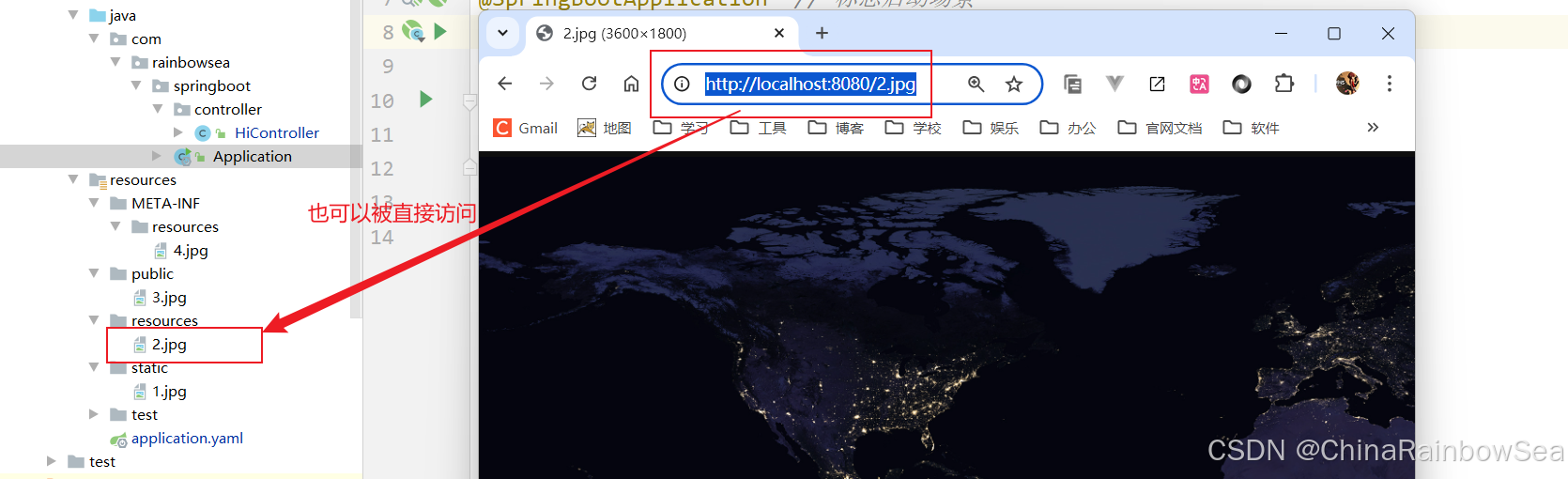 注意:classpath:/resources/ 表示服务器就会在 resources路径下找,你在浏览器当中输入的url地址的时候,不可以输入 resources 目录,因为服务器就是会在 classpath:/resources/ 找的,而如果你写了resources 在浏览器上的话,你想表达的就是:让浏览器从resources/resouces的路径下找,这是找不到的报404错误