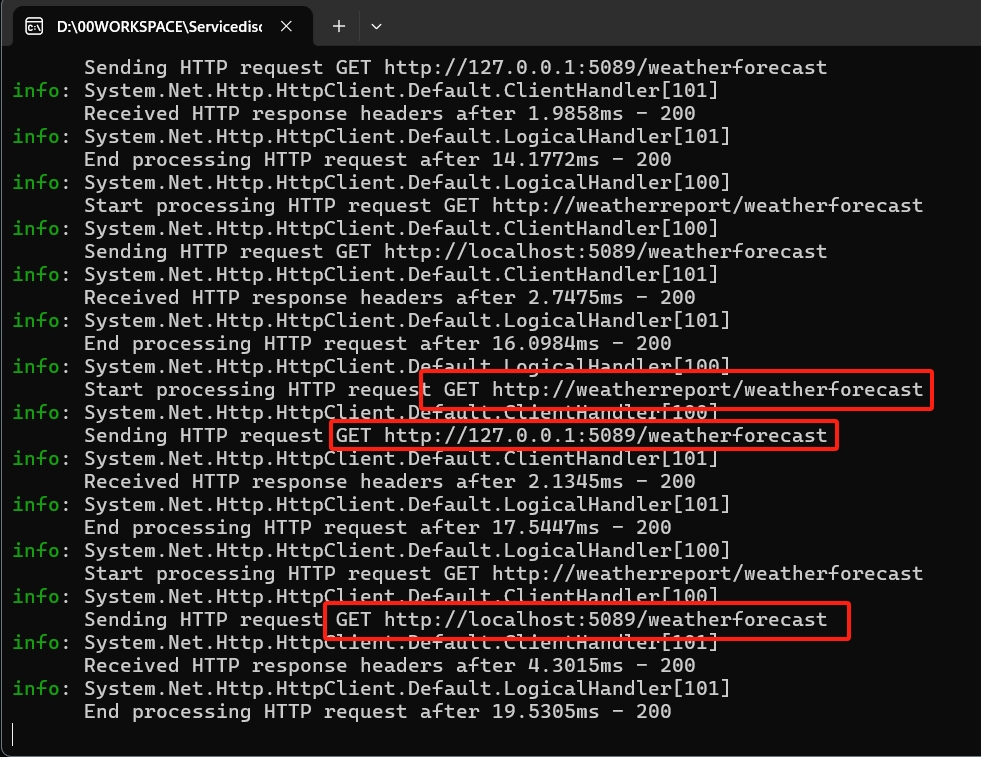 通过观察日志可以看到 http://weatherreport/weatherforecast 被转换成 http://127.0.0.1:5089 或 http://localhost:5089 的 http 调用。