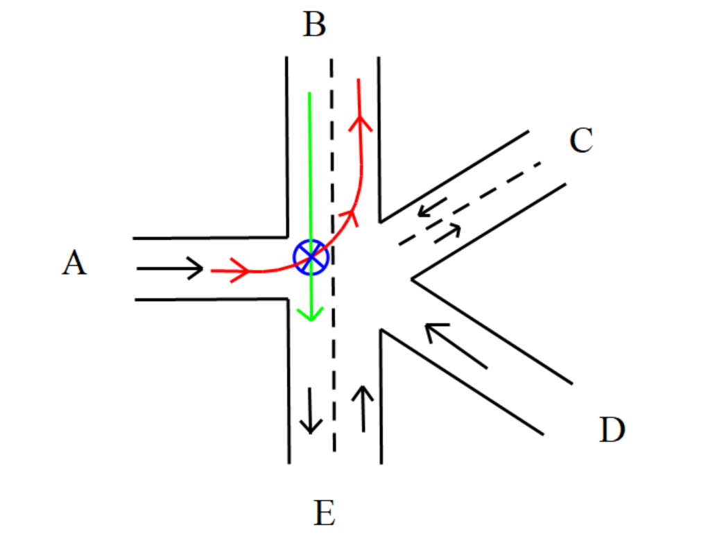 并且,该交通上可能存在许多冲突情况,关于具体的冲突情况,可以采用枚举的方式,固定一条道路,枚举其余道路,再判断是否冲突。就本题而言较为容易,但一旦道路情况复杂,则需要根据实际要求(例如进单行,出单行)进行合适的约束。