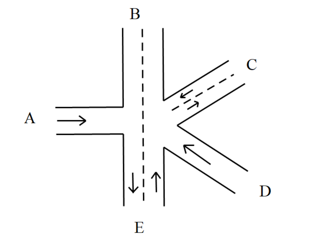 设A,B路口直通,C,D路口直通,其形成了一个十字路口。则道路通行情况可以为