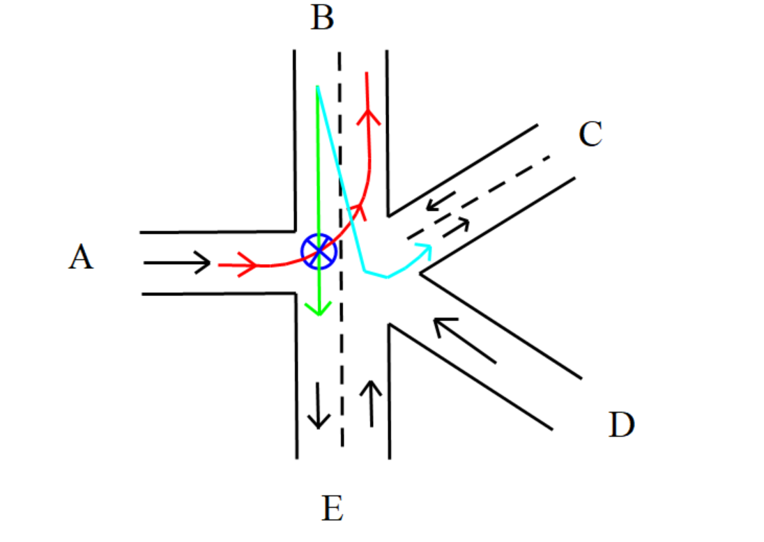 回归本题,右转由于不会与其余交通情况冲突,因此不作考虑,故需要考虑的则为道路冲突情况。下图给出了两种冲突情况