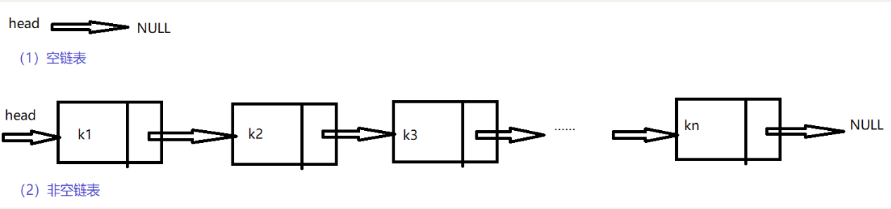 在这种存储方式下,必须有一个指针指向第一个结点的位置,一般用head来表示。