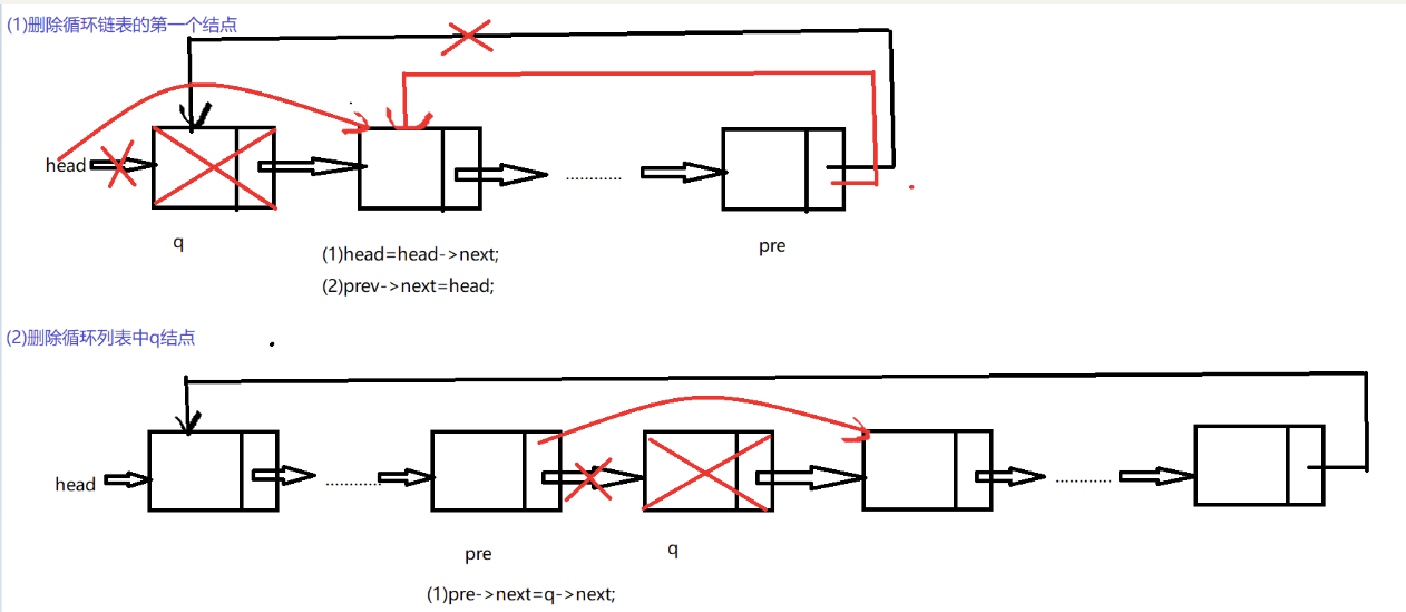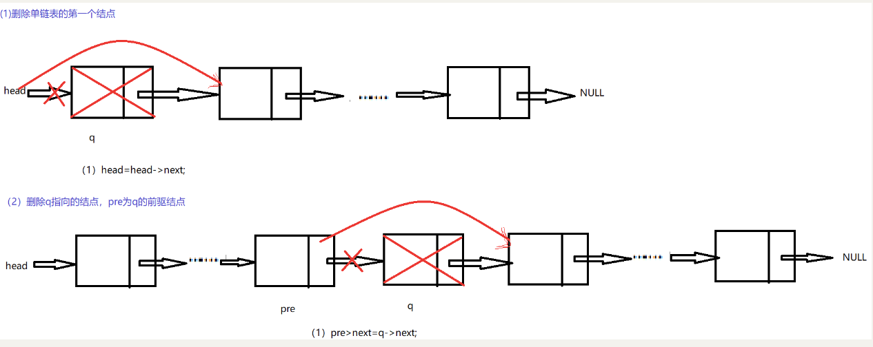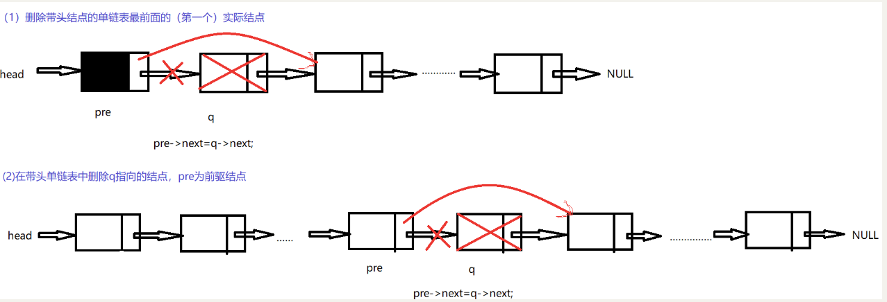 要想删除某个指定的结点,必须涉及到前驱结点,pre指向前驱结点,删除q结点,由于单链表第一个结点没有前驱结点,必须进行特殊处理。