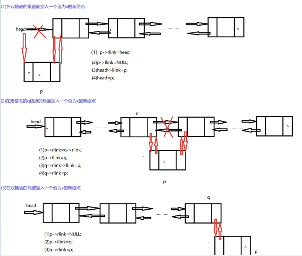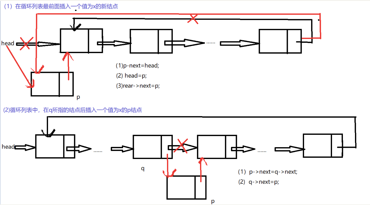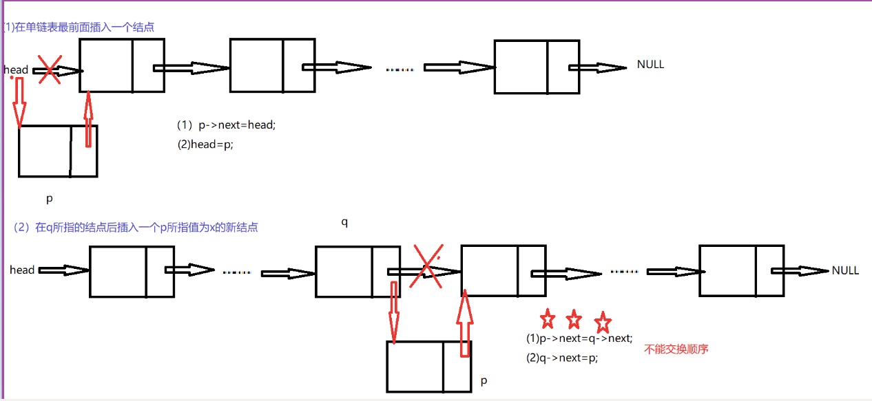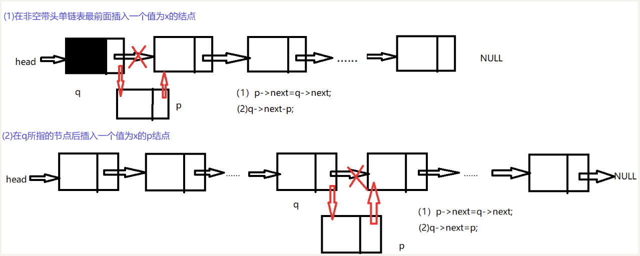 将新结点p插入到q结点的后面,插入到链表的最前面要做特殊处理