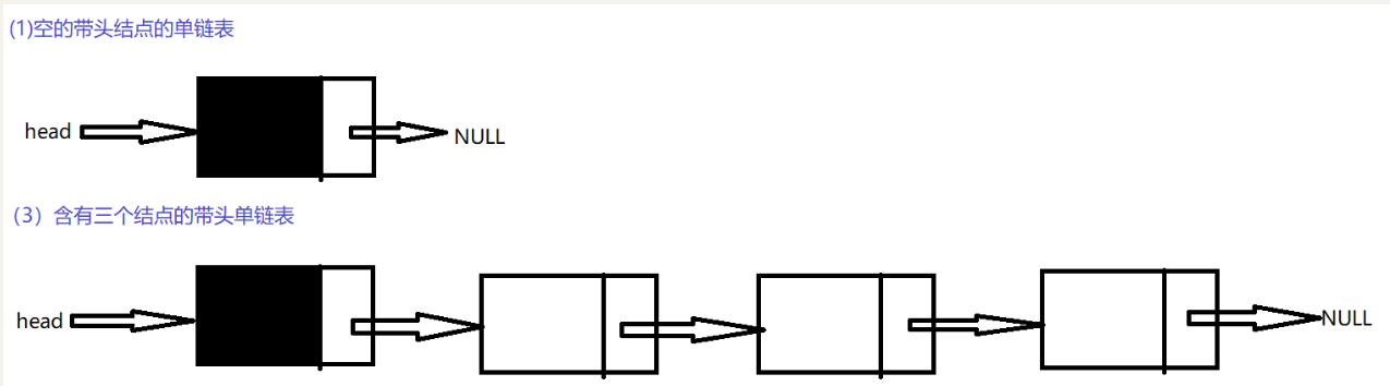 在带头单链表中,head指示的是头结点,而不是数据结构中的第一个结点,第一个结点实际上是由head->next指示的。其基本操作也和不带头单链表的实现是一样的。