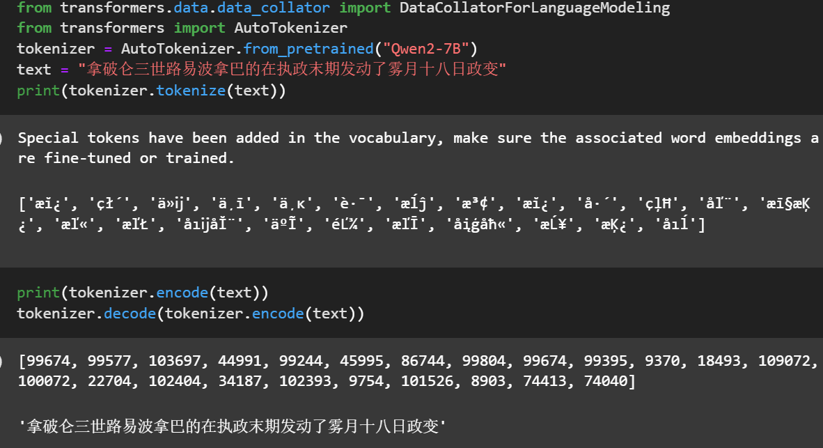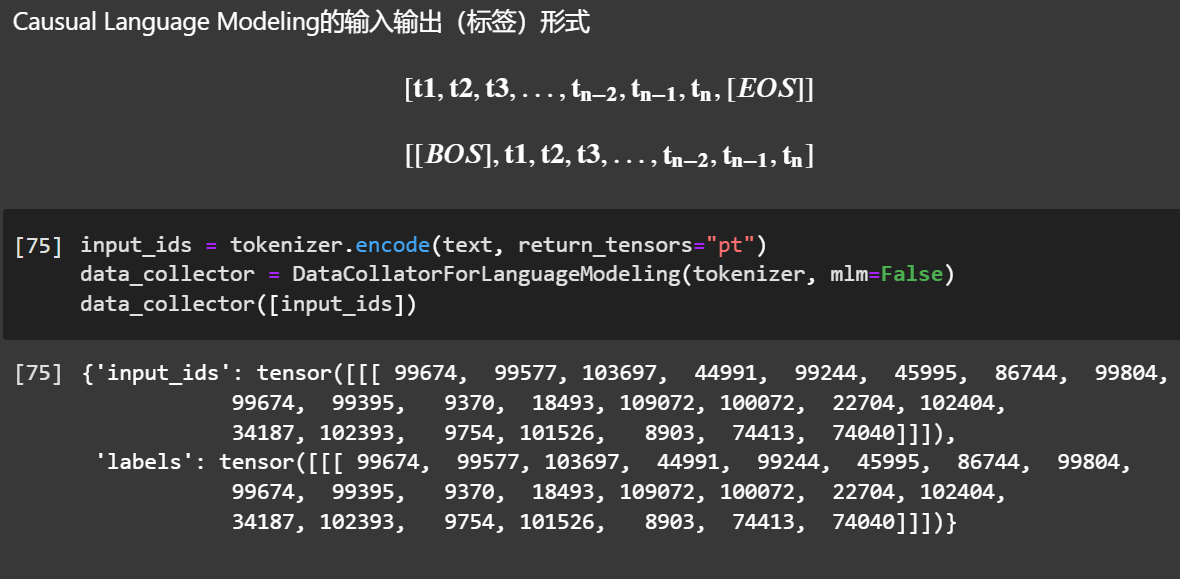 其中,DataCollatorForCompletionOnlyLM会为指令微调式的补全式训练,自动构造样本: