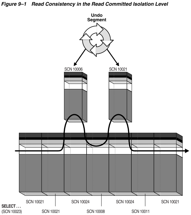 当数据库代表查询检索数据块时,数据库确保每个块中的数据反映了查询开始时块的内容。数据库根据需要回滚对块的更改,以将块重建到查询开始处理的时间点。