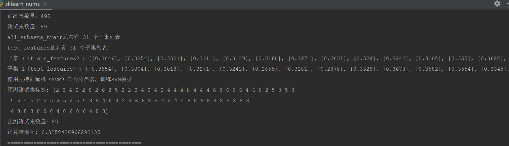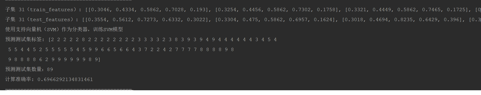 # 获取特征值列表的所有可能子集列表 def get_all_child_list(train_features_np, test_features_np): # 获取列数 num_cols = train_features_np.shape[1] # 初始化一个空列表来存储所有子集 all_subsets_train = [] all_subsets_test = [] # 遍历从1列到所有列的所有组合 for r in range(1, num_cols + 1): # 生成所有r列的组合索引 combinations_r_cols = list(itertools.combinations(range(num_cols), r)) # 遍历每个组合索引并提取数据 for cols in combinations_r_cols: # 使用NumPy索引从train_features_np中提取列 subset_train = train_features_np[:, list(cols)].tolist() # 使用相同的索引从test_features_np中提取列 subset_test = test_features_np[:, list(cols)].tolist() # 将子集添加到列表中 all_subsets_train.append(subset_train) all_subsets_test.append(subset_test) # 打印test_features的子集数量(与train_features相同) print(f"all_subsets_train总共有 {len(all_subsets_train)} 个子集列表") print(f"test_features总共有 {len(all_subsets_test)} 个子集列表") return all_subsets_train, all_subsets_test # 遍历所有子集特征值列表,然后训练模型和预测 def all_subsets_svc(all_subsets_train, all_subsets_test, train_labels, test_labels): # 打印前几个子集作为示例 for i, (subset_train_features, subset_test_features) in enumerate( zip(all_subsets_train, all_subsets_test)): # 仅打印前5个作为示例 print(f"子集 {i + 1}(train_features): {subset_train_features}") print(f"子集 {i + 1}(test_features): {subset_test_features}") # 使用支持向量机(SVM)作为分类器 clf = svm.SVC(C=0.5, kernel='poly') clf.fit(subset_train_features, train_labels) print("使用支持向量机(SVM)作为分类器,训练SVM模型") # 预测测试集 y_pred = clf.predict(subset_test_features) print('预测测试集标签:', y_pred) print(f"预测测试集数量:{y_pred.size}") # 计算准确率 accuracy = accuracy_score(test_labels, y_pred) print('计算准确率:', accuracy) print("=========================================")
