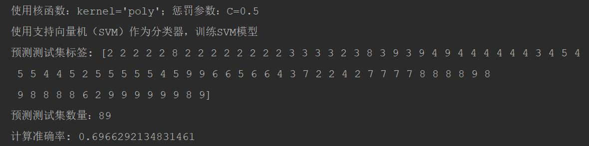 C=0.5, kernel=’poly’,计算准确率: 0.6966292134831461
