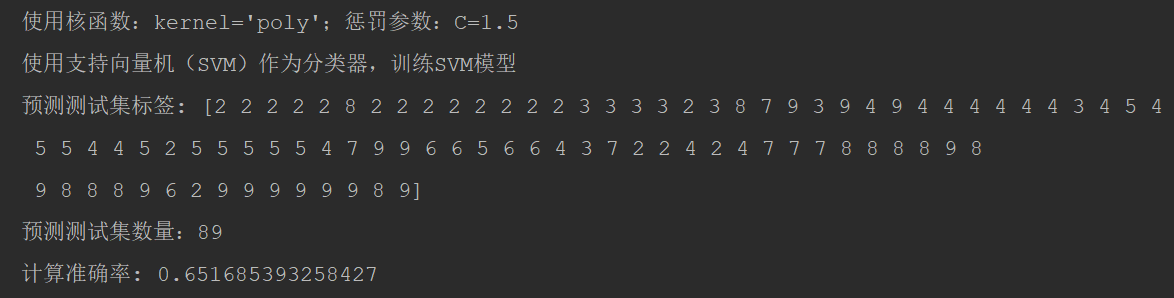 C=1.5, kernel=’poly’,计算准确率: 0.651685393258427