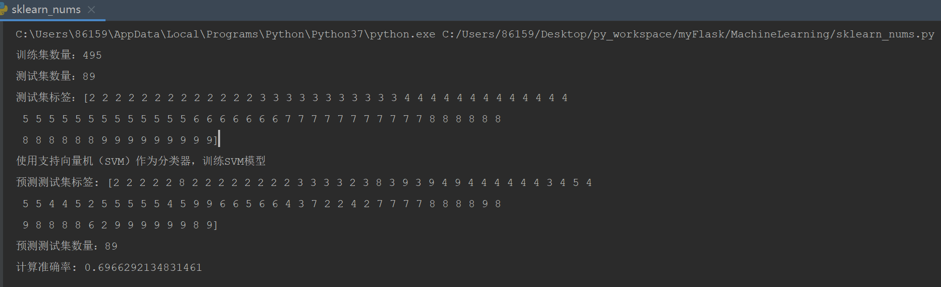 # 加载训练数据和测试数据 train_features, train_labels = load_dataset('./data/image_train') test_features, test_labels = load_dataset('./data/image_test') print(f"训练集特征值列表:{train_features}") print(f"测试集特征值列表:{test_features}") print(f"训练集标签:{train_labels}") print(f"测试集标签:{test_labels}") print(f"训练集数量:{train_labels.size}") print(f"测试集数量:{test_labels.size}")