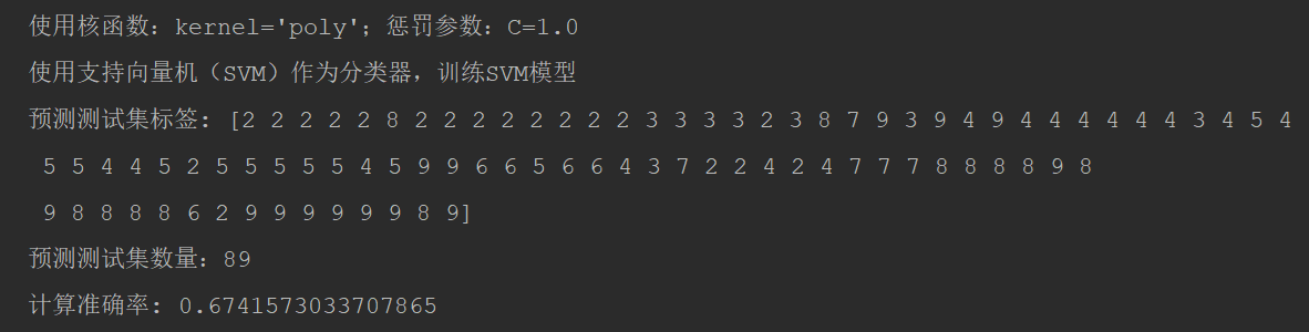 C=1.0, kernel=’poly’,计算准确率: 0.6741573033707865