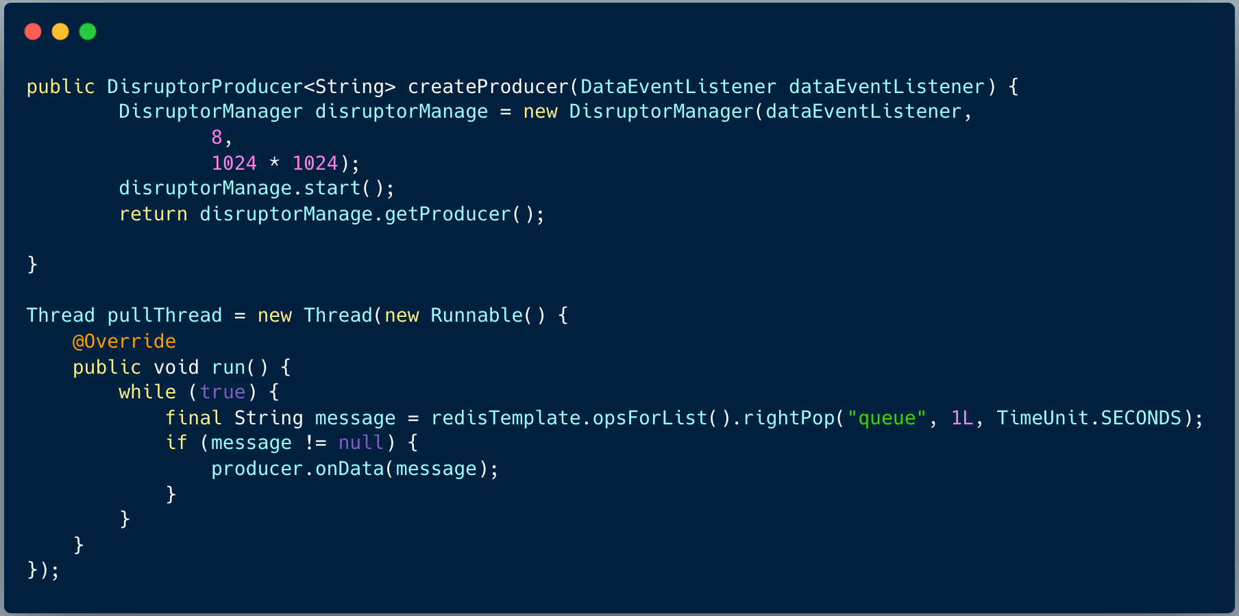 - 当拉取线程提交消息到 Disruptor 时,若环形缓冲区 RingBuffer 已经满了,则拉取线程会阻塞,这样天然的可以避免无限拉取,同时避免 OOM 的问题。