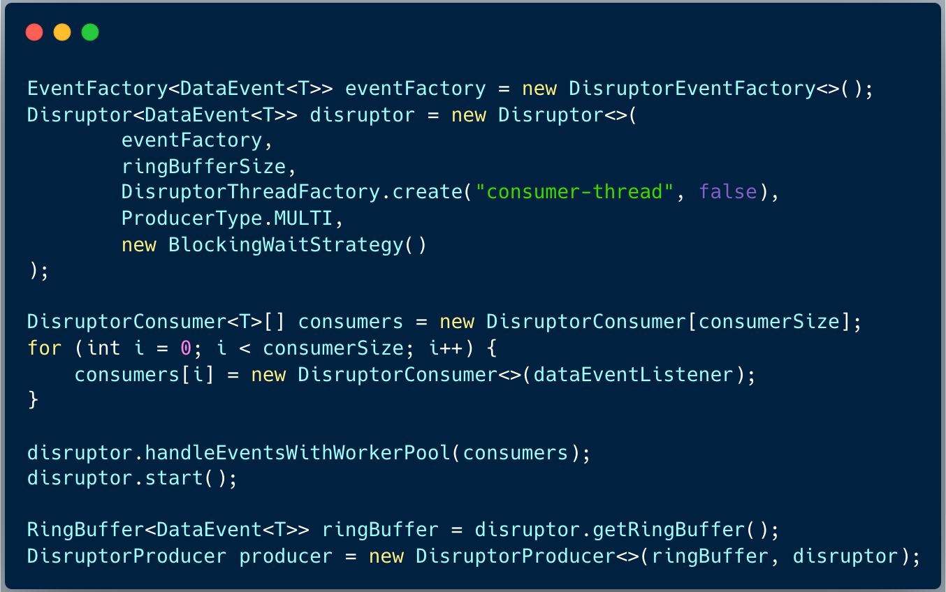 和线程池机制非常类似, Disruptor 也是非常典型的生产者/消费者模式。线程池存储提交任务的容器是阻塞队列,而 Disruptor 使用的是环形缓冲区 RingBuffer。
