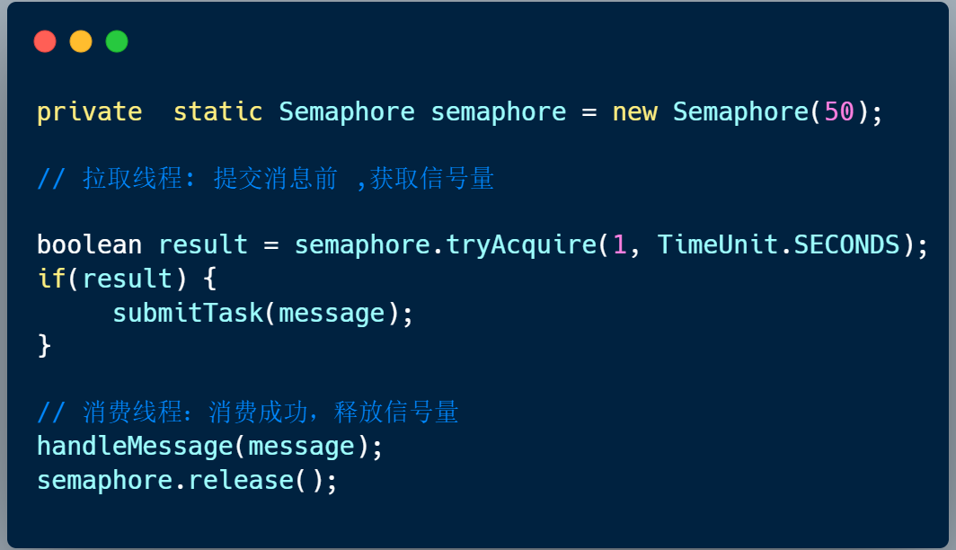 答案是:拉取线程提交消息到线程池时,当队列中消息数量到达一定数量时,提交消息到线程池会阻塞。