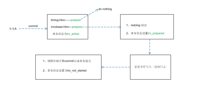 2、调用binlog-hton和innobase-hton的prepare方法完成第一阶段。binlog-hton的方法什么也没有做,innodb的prepare持有prepare_commit_mutex锁,将重做日志刷盘,并将事务状态设置为prepared。
